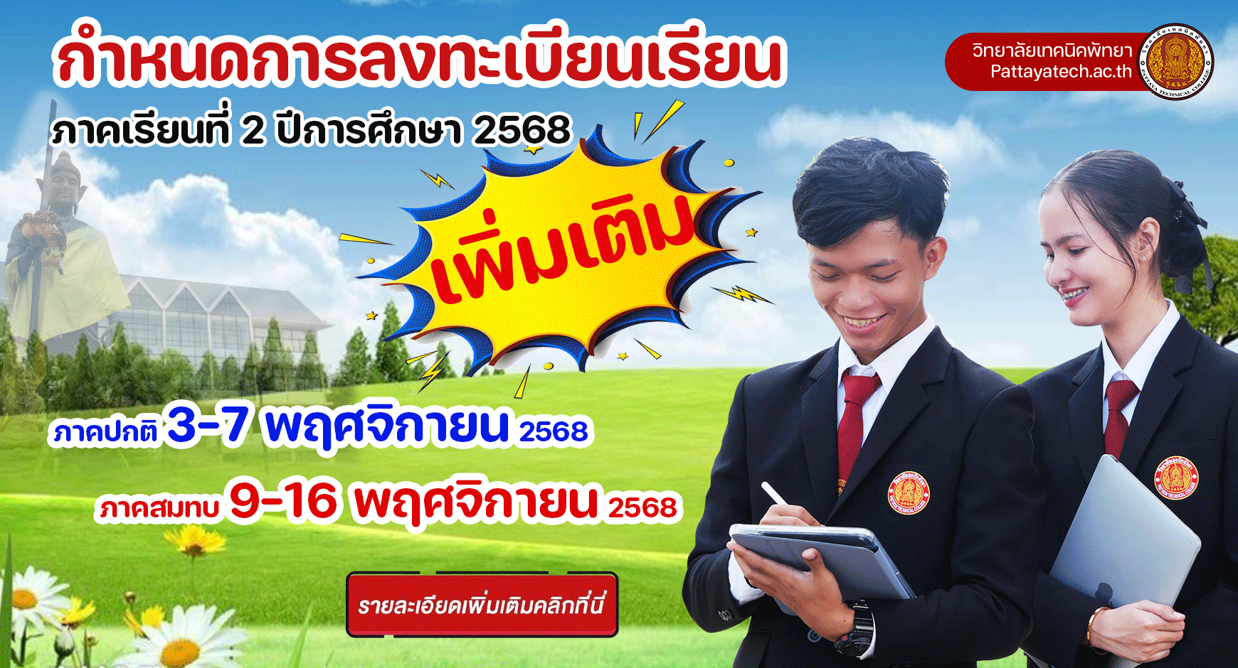 ประกาศ วิทยาลัยเทคนิคพัทยา เรื่อง กำหนดการลงทะเบียนเรียนเพิ่มเติม ภาคเรียนที่ 2 ประจำปีการศึกษา 2568