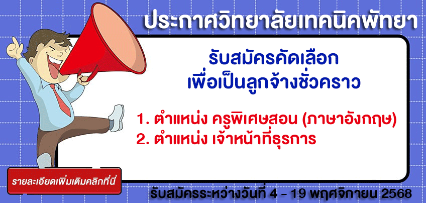 ประกาศ วิทยาลัยเทคนิคพัทยา เรื่อง รับสมัครคัดเลือกเพื่อเป็นลูกจ้างชั่วคราว ตำแหน่งครูพิเศษสอนและเจ้าหน้าที่ธุรการ ระหว่างวันที่ 4-19 พฤศจิกายน 2568