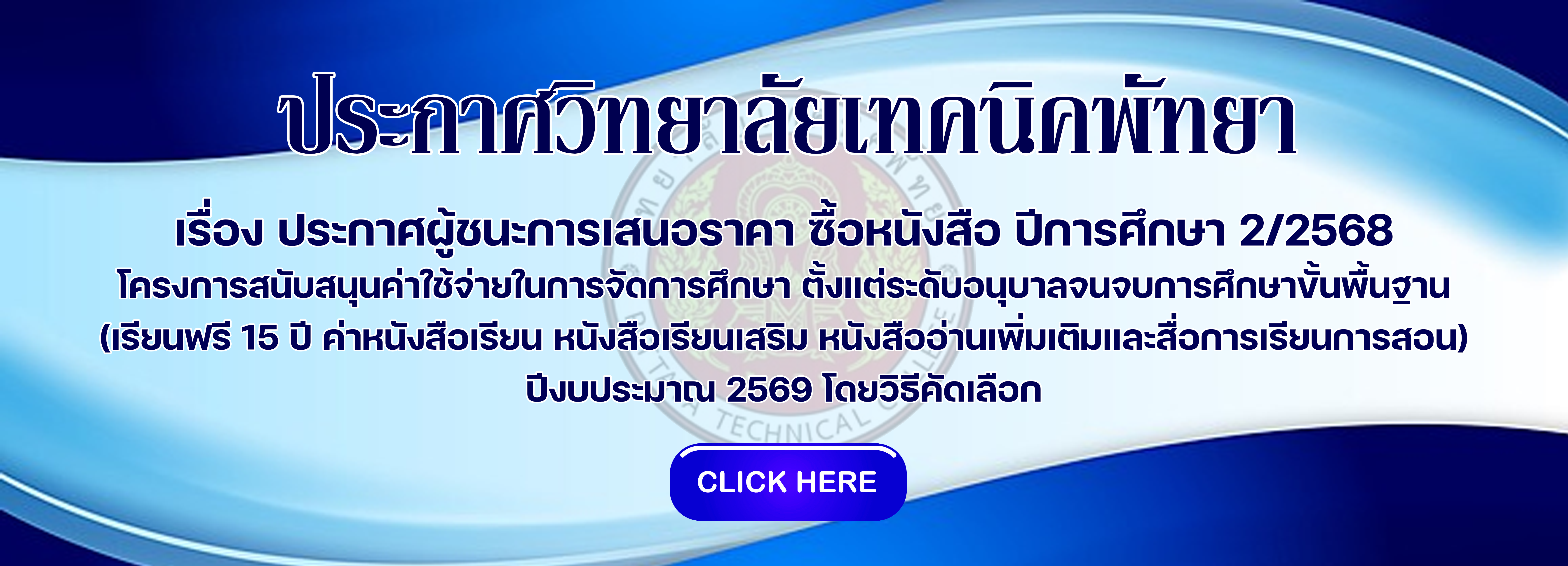 ประกาศวิทยาลัยเทคนิคพัทยา เรื่อง ประกาศผู้ชนะการเสนอราคา ซื้อหนังสือ ปีการศึกษา 2/2568 โครงการสนับสนุนค่าใช้จ่ายในการจัดการศึกษา ตั้งแต่ระดับอนุบาลจนจบกรศึกษาขั้นพื้นฐาน (เรียนฟรี 15 ปี ค่าหนังสือเรียน หนังสือเรียนเสริม หนังสืออ่านเพิ่มเติมและสื่การเรียนการสอน) ปีงบประมาณ 2569 โดยวิธีคัดเลือก