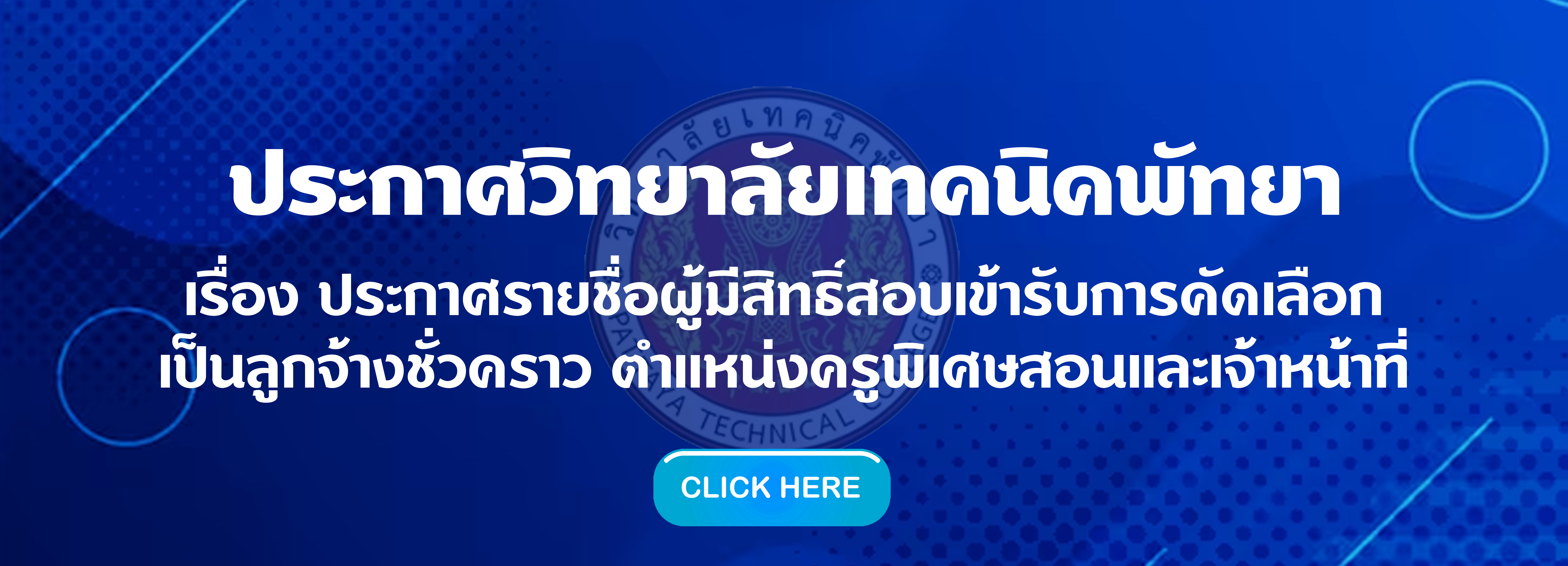 ประกาศ วิทยาลัยเทคนิคพัทยา เรื่อง ประกาศรายชื่อผู้มีสิทธิ์สอบเพื่อเป็นลูกจ้างชั่วคราว ตำแหน่งครูพิเศษสอน , เจ้าหน้าที่ธุรการ และ พนักงานขับรถ