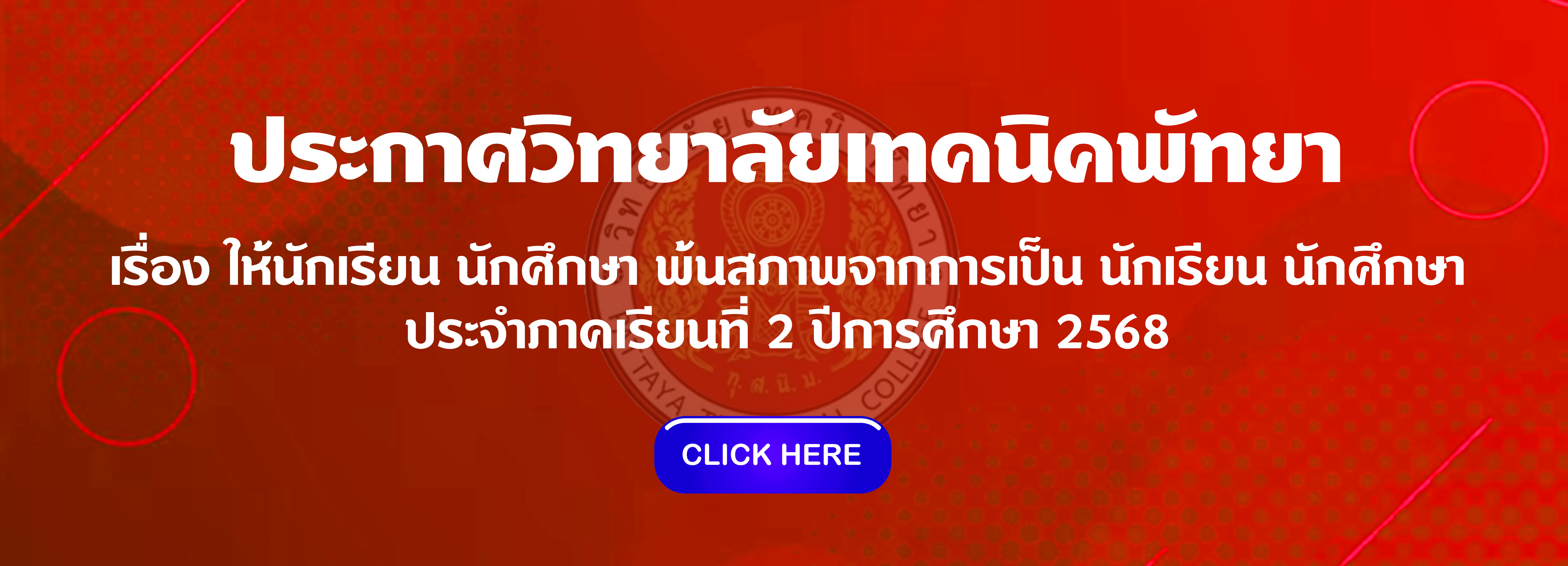 ประกาศ วิทยาลัยเทคนิคพัทยา เรื่อง ให้นักเรียน นักศึกษา พ้นสภาพจากการเป็นนักเรียน นักศึกษา ประจำภาคเรียนที่ 2 ปีการศึกษา 2568