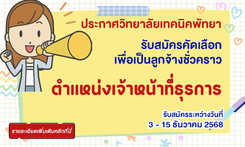 ประกาศ วิทยาลัยเทคนิคพัทยา เรื่อง รับสมัครคัดเลือกเพื่อเป็นลูกจ้างชั่วคราว ตำแหน่งเจ้าหน้าที่ธุรการ ระหว่างวันที่ 3 - 15 ธันวาคม 2568