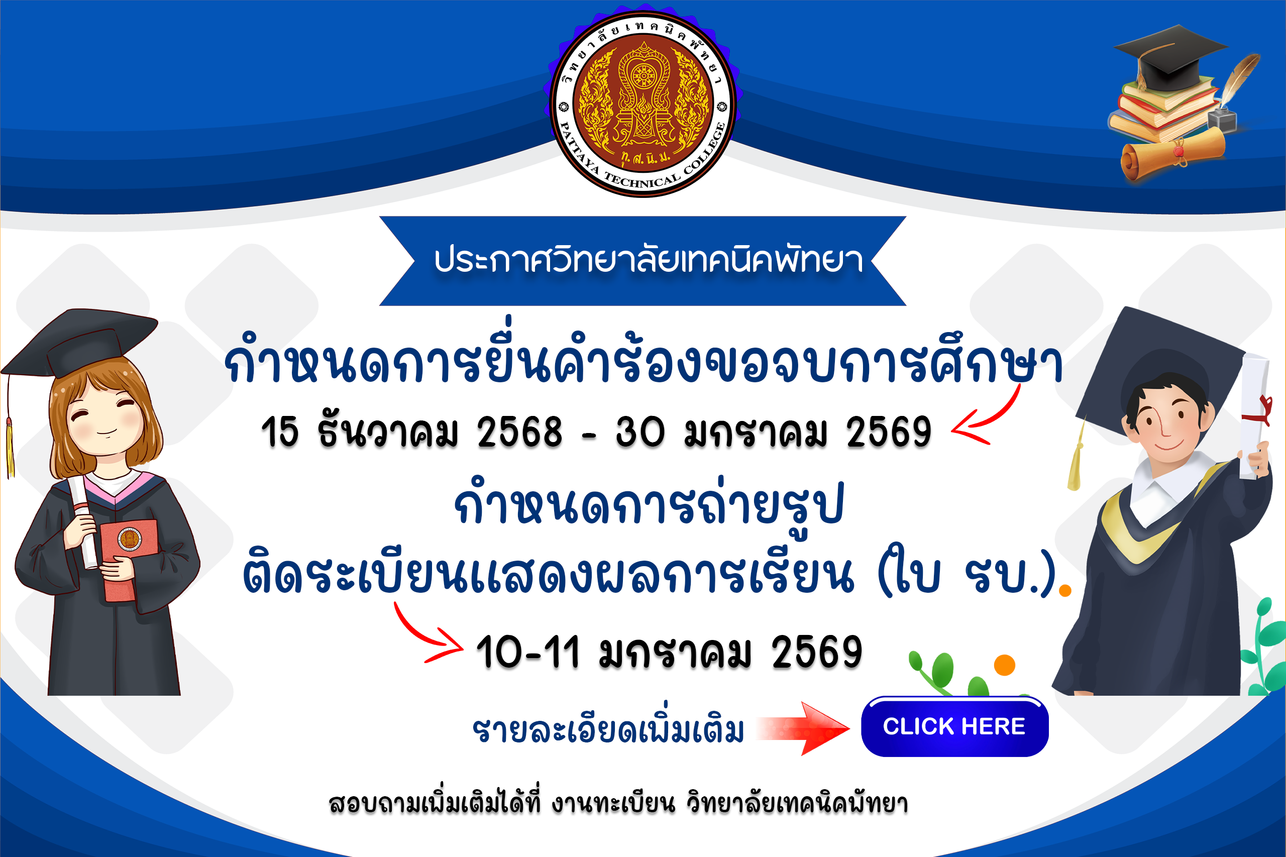 ประกาศ วิทยาลัยเทคนิคพัทยา เรื่อง กำหนดการยื่นคำร้องขอจบการศึกษา และ กำหนดการถ่ายรูปติดระเบียนแสดงผลการเรียน (ใบ รบ.) ประจำปีการศึกษา 2568
