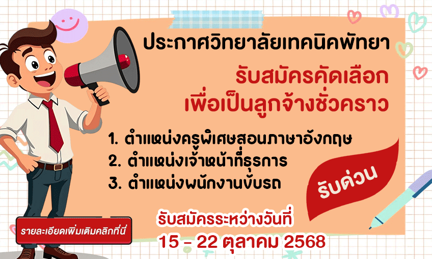 ประกาศ วิทยาลัยเทคนิคพัทยา เรื่อง รับสมัครคัดเลือกเพื่อเป็นลูกจ้างชั่วคราว ตำแหน่งครูพิเศษสอน , เจ้าหน้าที่ธุรการ และ พนักงานขับรถ ระหว่างวันที่ 15-22 ตุลาคม 2568