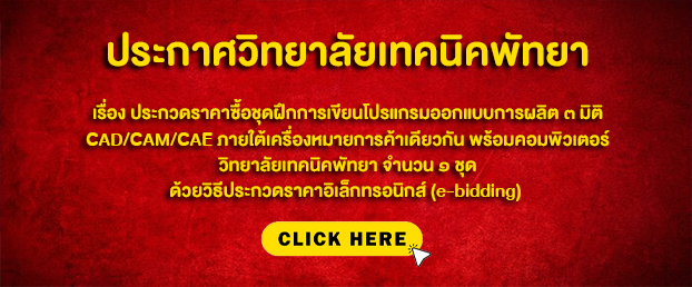 ประกาศวิทยาลัยเทคนิคพัทยา เรื่อง ประกวดราคาซื้อชุดฝึกการเขียนโปรแกรมออกแบบการผลิต ๓ มิติ CAD/CAM/CAE ภายใต้ เครื่องหมายการค้าเดียวกัน พร้อมคอมพิวเตอร์ วิทยาลัยเทคนิคพัทยา ตำบลนาเกลือ อำเภอบางละมุง จังหวัดชลบุรี จำนวน ๑ ชุด ด้วยวิธีประกวดราคาอิเล็กทรอนิกส์ (e-bidding)