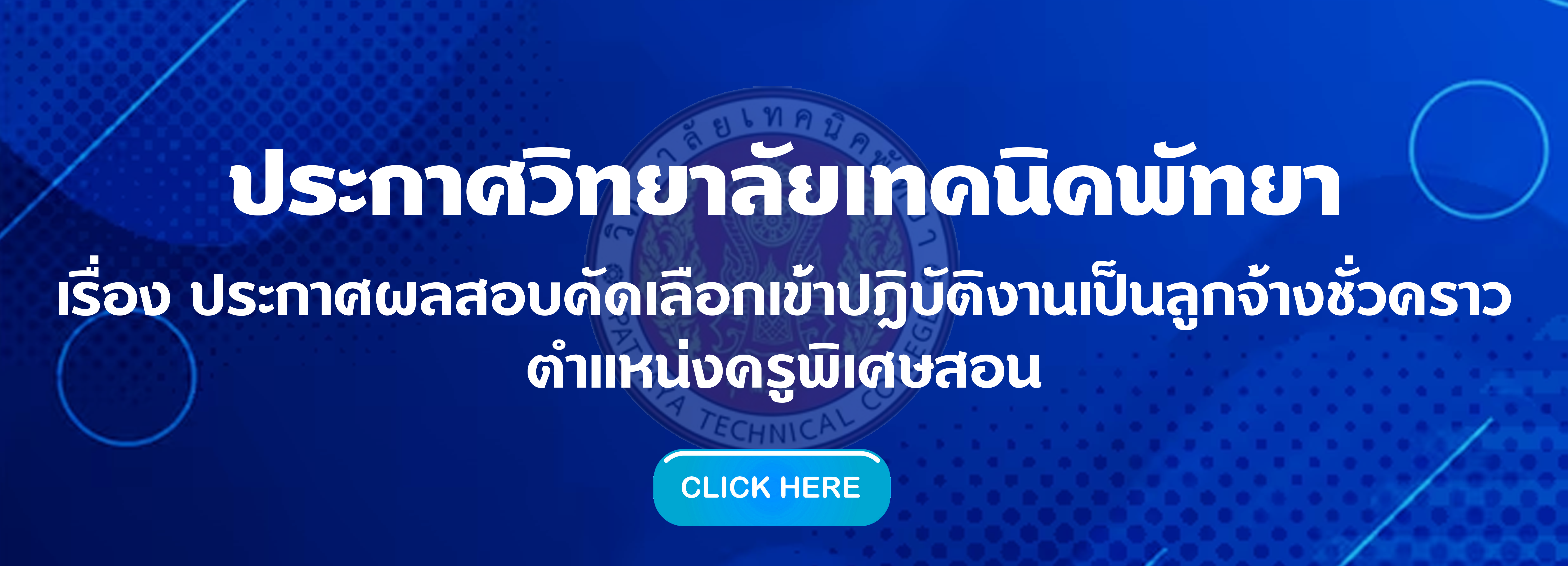 ประกาศ วิทยาลัยเทคนิคพัทยา เรื่อง รายชื่อผู้มีสิทธิ์สอบเข้ารับการคัดเลือก ตำแหน่งครูพิเศษสอน แผนกวิชาช่างเทคนิคคอมพิวเตอร์และแผนกวิชาเมคคาทรอนิกส์