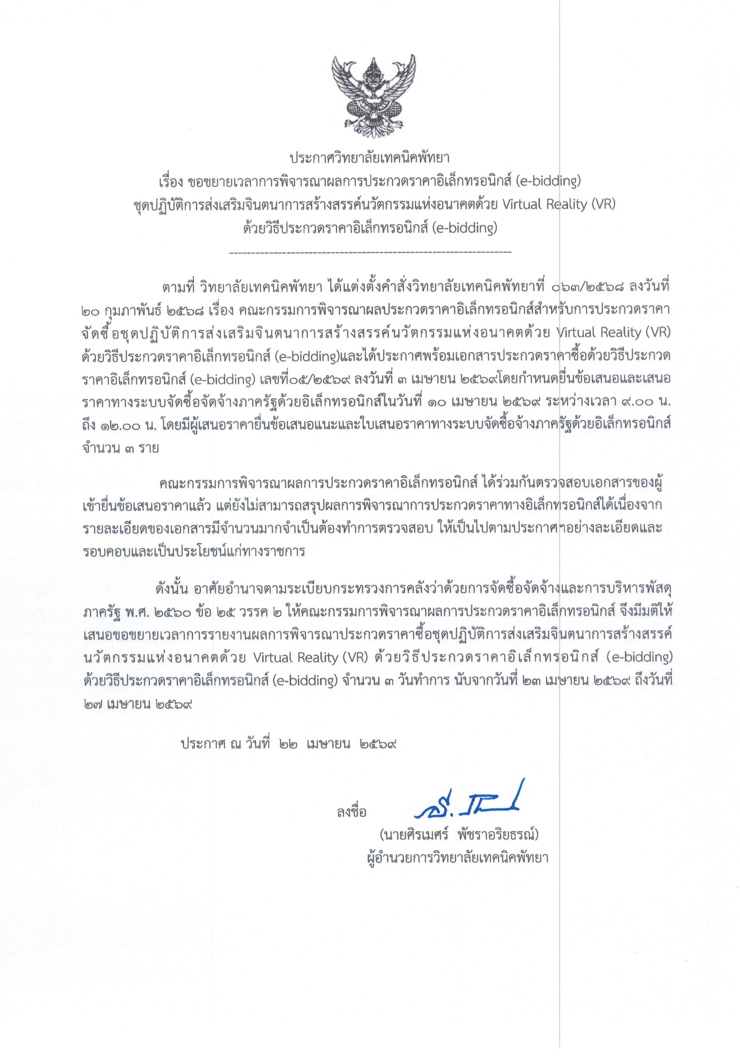 ประกาศวิทยาลัยเทคนิคพัทยา เรื่อง ขอขยายเวลาการพิจารณาผลการประกวดราคาอิเล็กทรอนิกส์ (e-bidding) ชุดปฎิบัติการส่งเสริมจินตนาการสร้างสรรค์นวัตกรรมแห่งอนาคต Virtual Reality (VR) ด้วยวิธีประกวดราคาอิเล็กทรอนิกส์ (e-bidding)