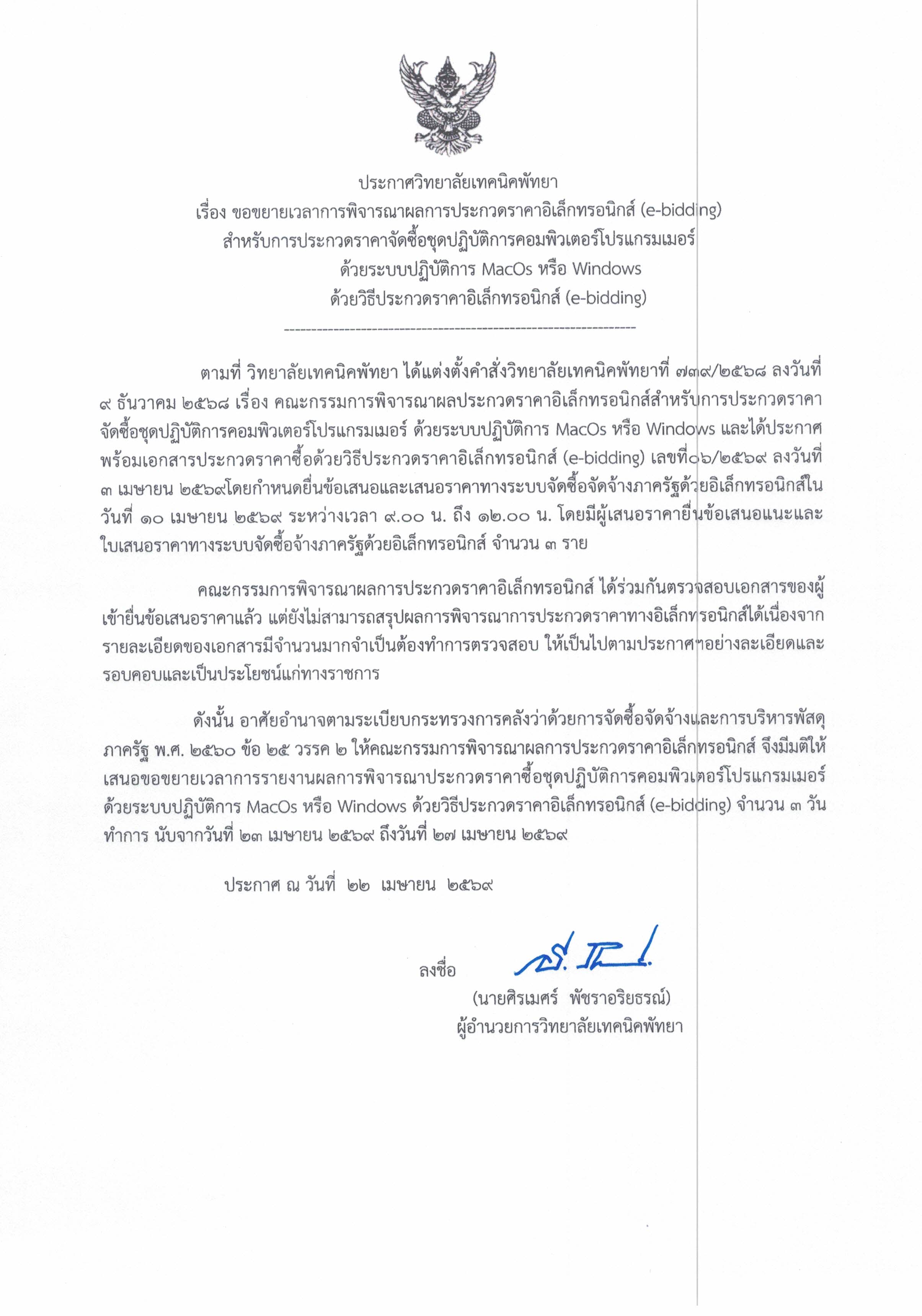 ประกาศวิทยาลัยเทคนิคพัทยา เรื่อง ขอขยายเวลาการพิจารณาผลการประกวดราคาอิเล็กทรอนิกส์ (e-bidding) สำหรับการประกวดราคาจัดซื้อชุดปฎิบัติการคอมพิวเตอร์โปรแกรมเมอร์ ระบบปฏิบัติการ MacOS หรือ Windows ด้วยวิธีประกวดราคาอิเล็กทรอนิกส์ (e-bidding)