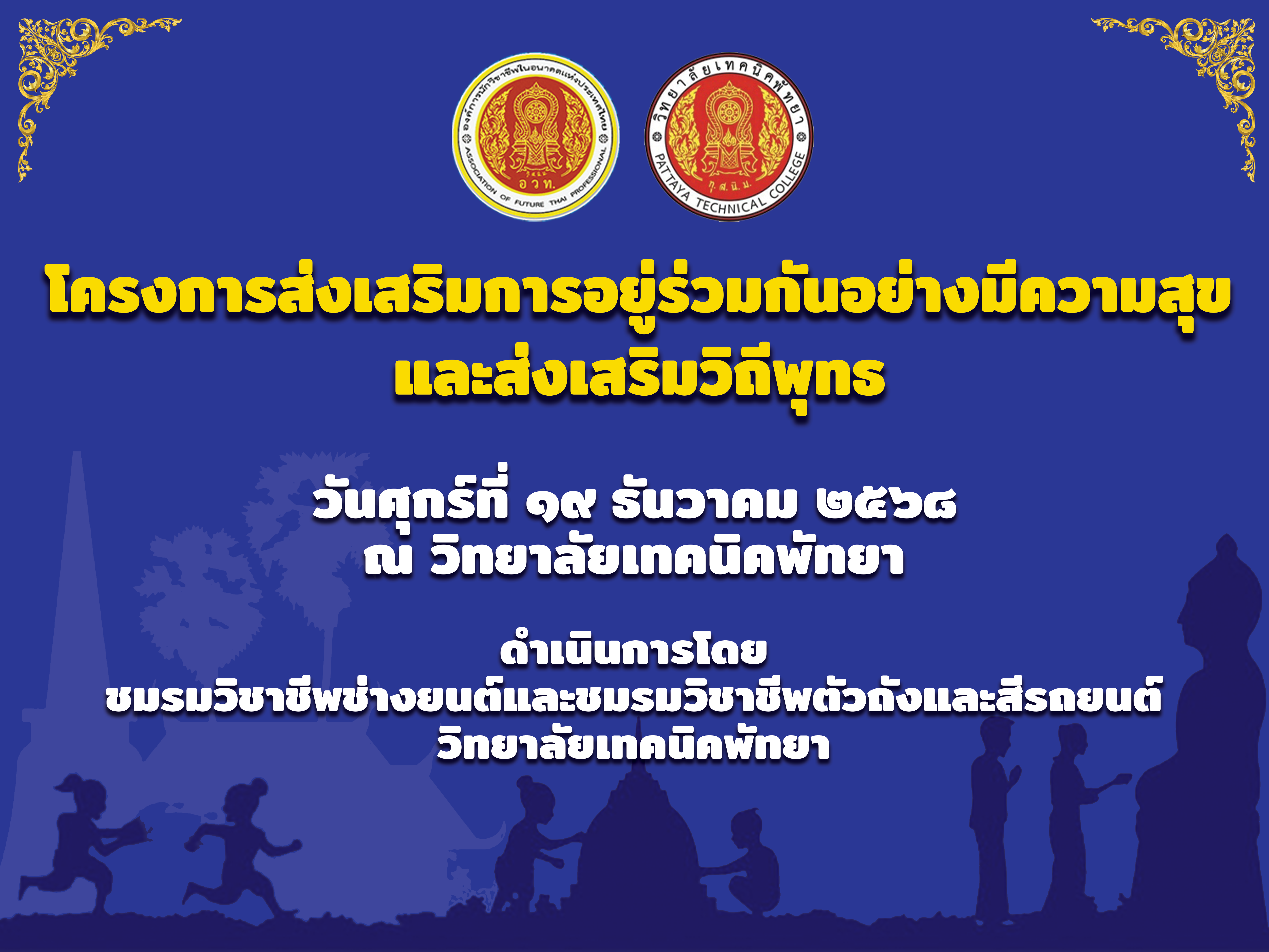 ประชาสัมพันธ์ วิทยาลัยเทคนิคพัทยา เรื่อง การดำเนินโครงการส่งเสริมการอยู่ร่วมกันอย่างมีความสุขและส่งเสริมวิถีพุทธ ในวันศุกร์ที่ 19 ธันวาคม 2568 ดำเนินงานโดย ชมรมวิชาชีพช่างยนต์และชมรมวิชาชีพตัวถังและสีรถยนต์ วิทยาลัยเทคนิคพัทยา