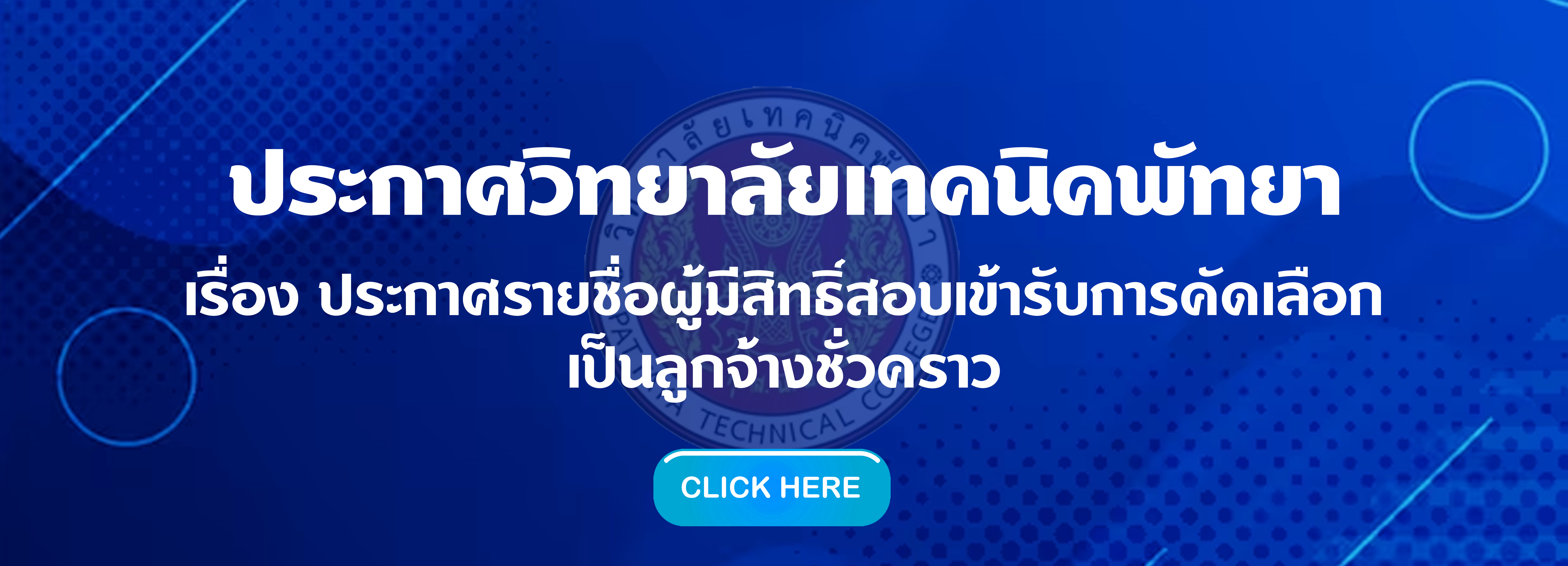 ประกาศ วิทยาลัยเทคนิคพัทยา เรื่อง ประกาศรายชื่อผู้มีสิทธิ์สอบคัดเลือกเพื่อเป็นลูกจ้างชั่วคราว ตำแหน่งเจ้าหน้าที่ธุรการ