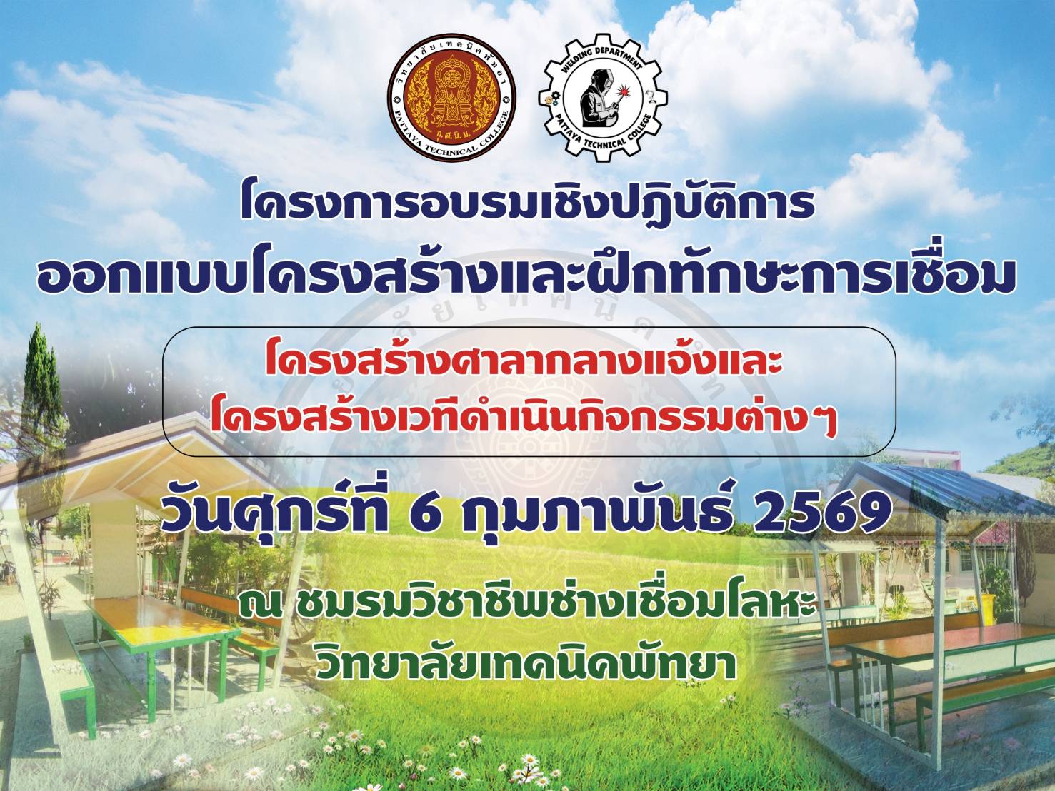 ประชาสัมพันธ์ วิทยาลัยเทคนิคพัทยา เรื่อง การดำเนินโครงการอบรมเชิงปฎิบัติการออกแบบโครงสร้างและฝึกทักษะการเชื่อม โครงสร้างศาลากลางแจ้งและโครงสร้างเวทีดำเนินกิจกรรมต่างๆ ในวันที่ 6 กุมภาพันธ์ 2569 ณ ชมรมวิชาชีพช่างเชื่อมโลหะ วิทยาลัยเทคนิคพัทยา