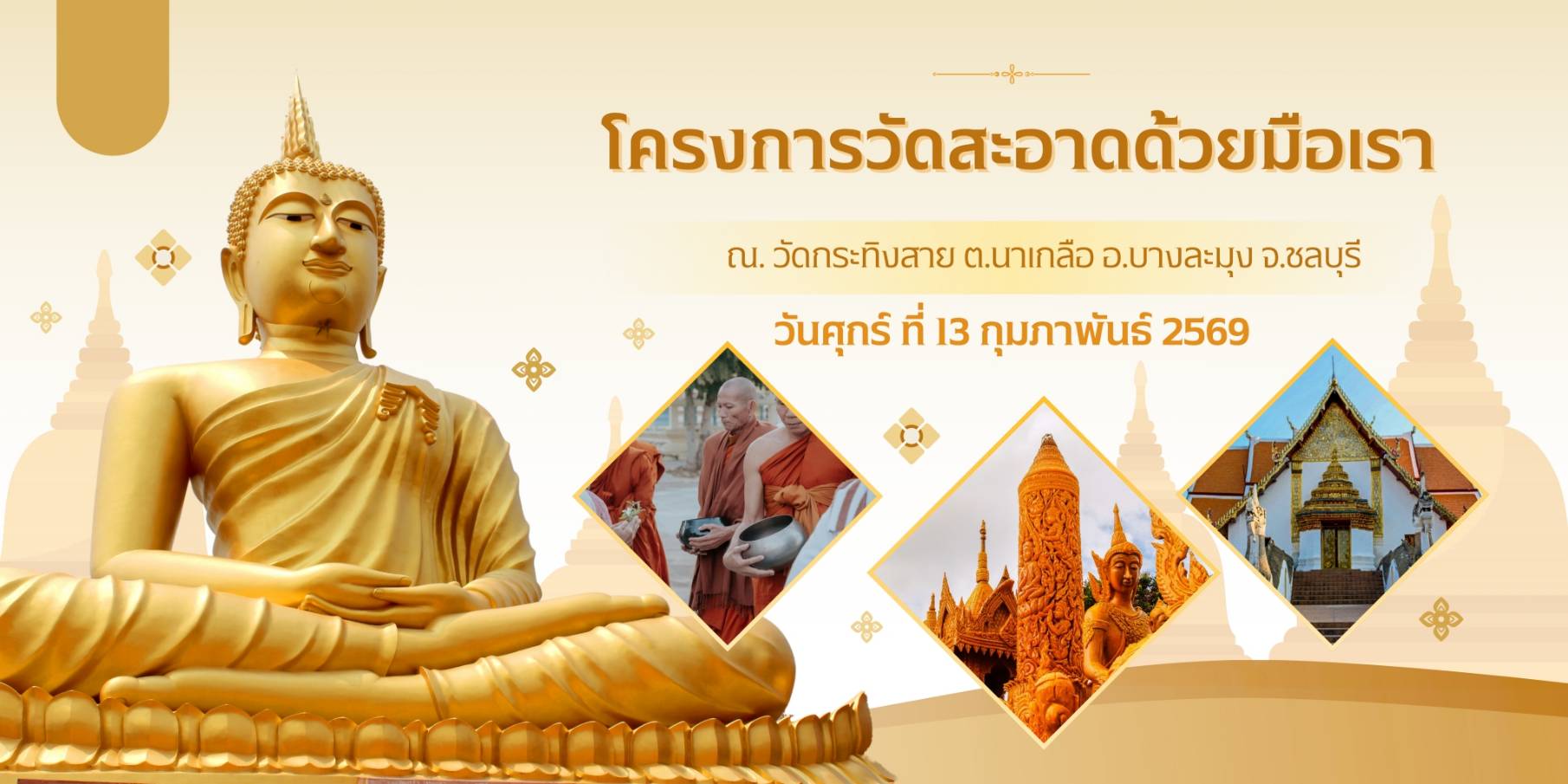 ประชาสัมพันธ์ วิทยาลัยเทคนิคพัทยา เรื่อง การดำเนินโครงการวัดสะอาดด้วยมือเรา ในวันที่ 13 กุมภาพันธ์ 2569 ณ วัดกระทิงลาย ดำเนินการโดย ชมรมวิชาชีพช่างเชื่อมโลหะ วิทยาลัยเทคนิคพัทยา