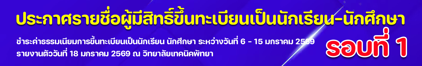 ประกาศ วิทยาลัยเทคนิคพัทยา เรื่อง กำหนดการรับสมัครนักเรียน เพื่อเข้าศึกษาต่อระดับประกาศนียบัตรวิชาชีพ (ปวช.) และ ระดับประกาศนียบัตรวิชาชีพชั้นสูง (ปวส.) รอบทั่วไป ประจำปีการศึกษา 2569