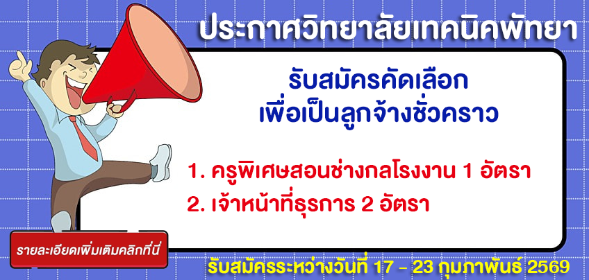 ประกาศ วิทยาลัยเทคนิคพัทยา เรื่อง รับสมัครคัดเลือกเพื่อเป็นลูกจ้างชั่วคราว ตำแหน่งครูพิเศษสอน 1 อัตรา และ เจ้าหน้าที่ธุรการ 2 อัตรา ระหว่างวันที่ 17 - 23 กุมภาพันธ์ 2569