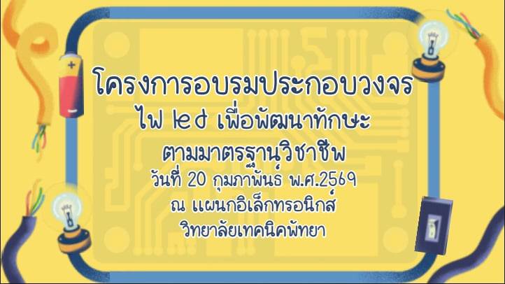 ประชาสัมพันธ์ วิทยาลัยเทคนิคพัทยา เรื่อง การดำเนินโครงการอบรมประกอบวงจรไฟ LED เพื่อพัฒนาทักษะตามมาตรฐานวิชาชีพ ในวันที่ 20 กุมภาพันธ์ 2569 ณ แผนกวิชาอิเล็กทรอนิกส์ วิทยาลัยเทคนิคพัทยา