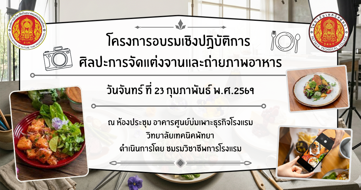 ประชาสัมพันธ์ วิทยาลัยเทคนิคพัทยา เรื่อง โครงการอบรมเชิงปฎิบัติการ ศิลปะการจัดแต่งจานและถ่ายภาพอาหาร ในวันจันทร์ที่ 23 กุใภาพันธ์ 2569 ณ ห้องประชุม อาคารศูนย์บ่มเพาะธุรกิจโรงแรม วิทยาลัยเทคนิคพัทยา ดำเนินการโดย ชมรมวิชาชีพการโรงแรม