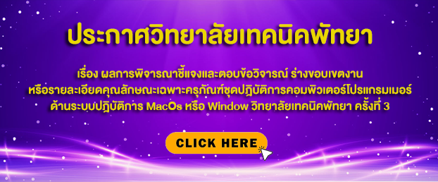 ประกาศวิทยาลัยเทคนิคพัทยา เรื่อง ผลการพิจารณาชี้แจงและตอบข้อวิจารณ์ ร่างขอบเขตงานหรือรายละเอียดคุณลักษณะเฉพาะครุภัณฑ์ชุดปฎิบัติการคอมพิวเตอร์โปรแกรมเมอร์ ด้านระบบปฎิบัติการ MacOs หรือ Window วิทยาลัยเทคนิคพัทยา ครั้งที่ 3