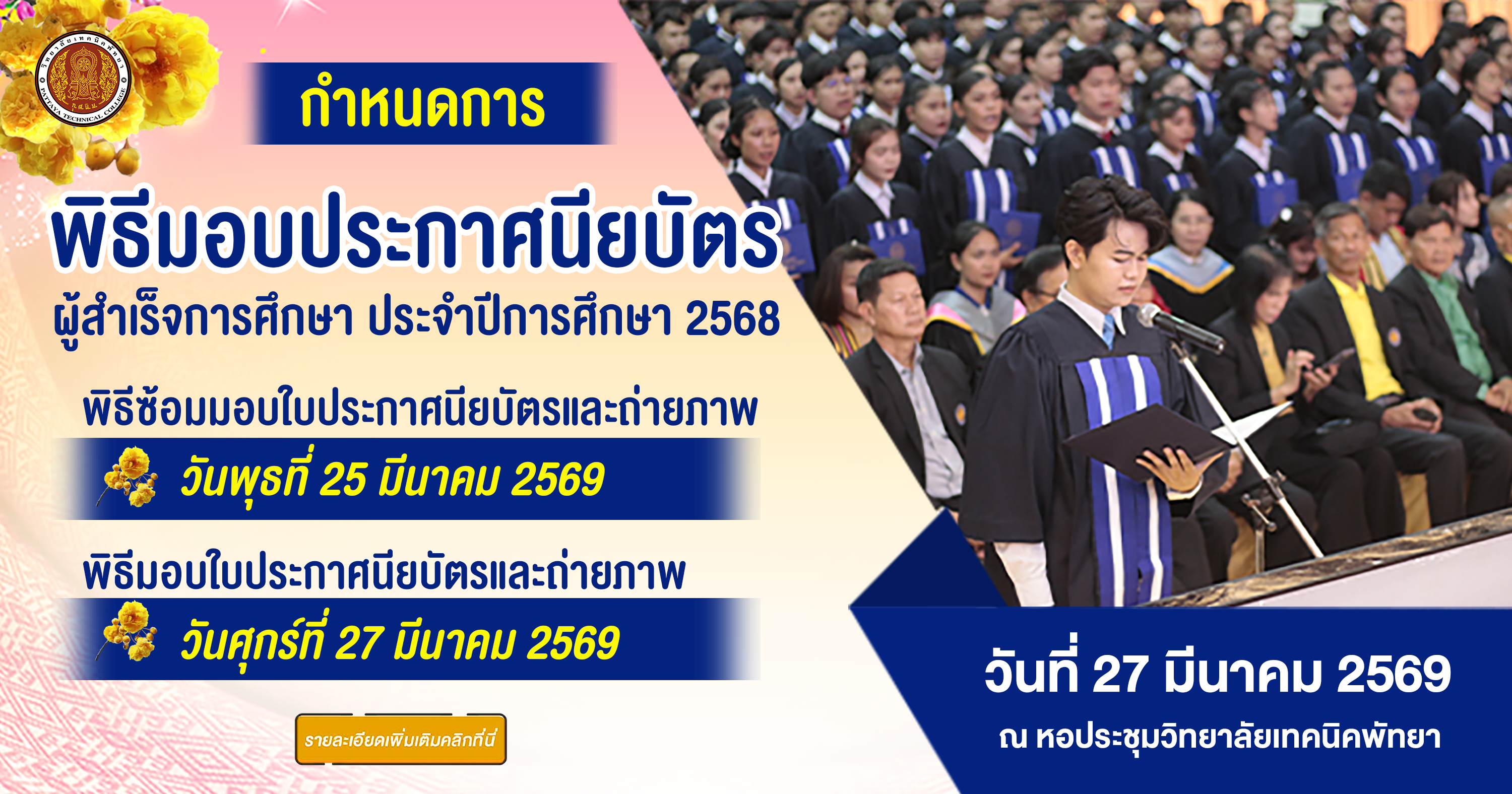 ประกาศ วิทยาลัยเทคนิคพัทยา เรื่อง กำหนดการพิธีมอบประกาศนียบัตรผู้สำเร็จการศึกษา ประจำปีการศึกษา 2568