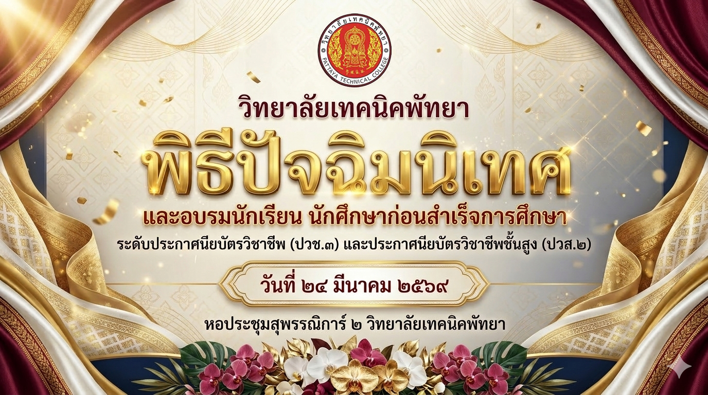 ประชาสัมพันธ์ วิทยาลัยเทคนิคพัทยา เรื่อง กำหนดการพิธีปัจฉิมนิเทศและอบรมนักเรียน นักศึกษา ก่อนสำเร็จการศึกษา ระดับประกาศนียบัตรวิชาชีพ (ปวช.3)และ ระดับประกาศนียบัตรวิชาชีพชั้นสูง (ปวส.2) ประจำปีการศึกษา 2568